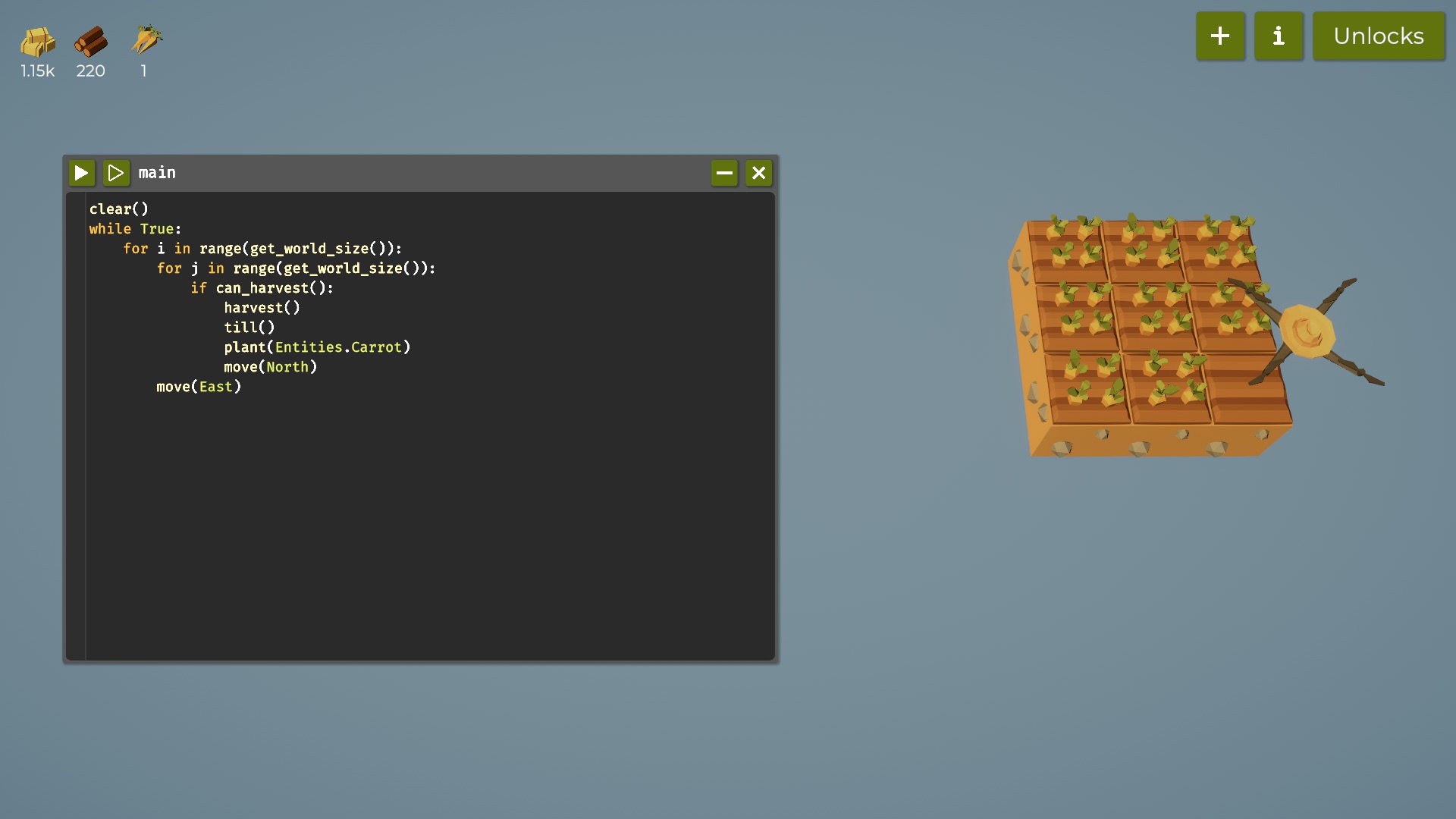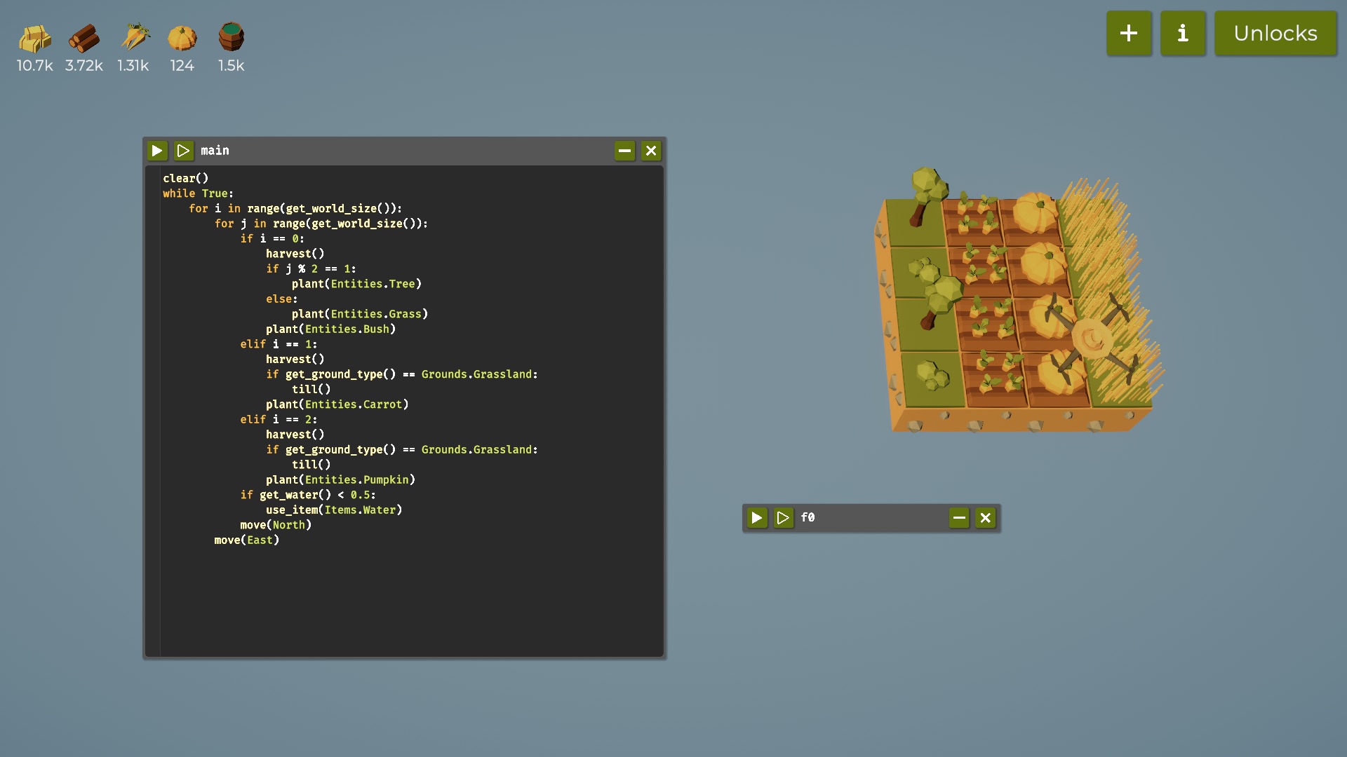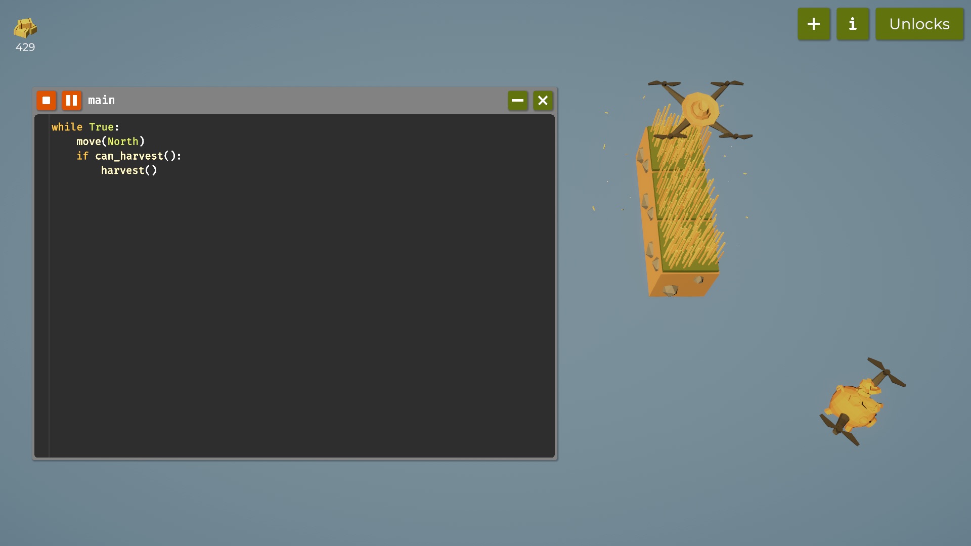 The Farmer was replaced does a great job at blending the farming style with programming. The idea is clever, you write code (do not be alarmed non-programmers!) to control a drone that will perform tasks on the farm for you.